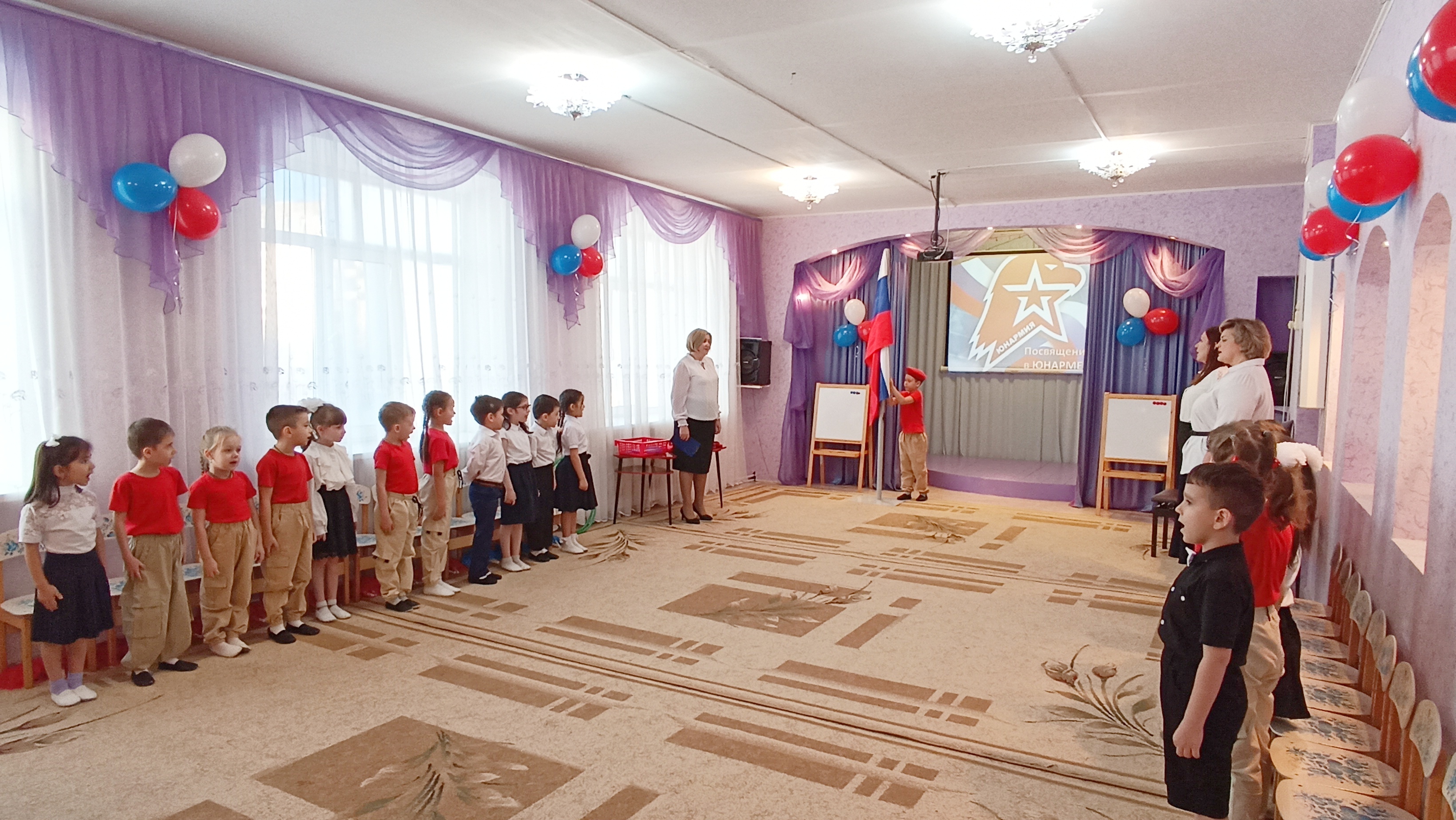 Каждый понедельник у детей старшего дошкольного возраста начинается с традиционного поднятия флага РФ и исполнения Гимна России. В 8.00ч. группы старшего дошкольного возраста встречаются в музыкальном зале ДОУ. Под торжественное исполнение Гимна России детьми и взрослыми, воспитатель или ребенок (посвященный в юнармейцы) поднимает флаг РФ. Данная традиция позволяет воспитывать истинных патриотов своей страны, которые с уважением относятся к государственной символике.